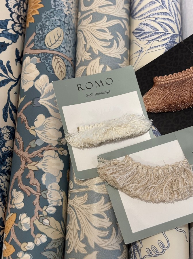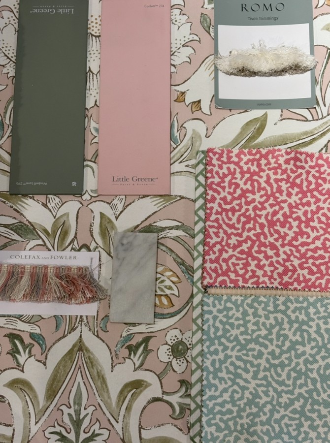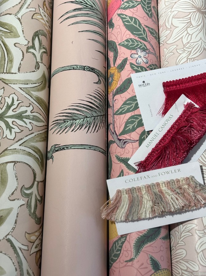 "Jag valde fem stycken produkter som passade bra med varandra. Jag utgick ifrån en tapet jag tyckte var fin och så tog jag fram ett tyg och två stycken färger som matchade bra ihop med detaljerna på tapeten. Tapeten och tyget är ifrån GP & J Baker, tapeten heter Little Magnolia och tyget Symington. De två färgerna jag valde är ifrån Little Greene, Pleat 280 och Gauze - Dark 166."