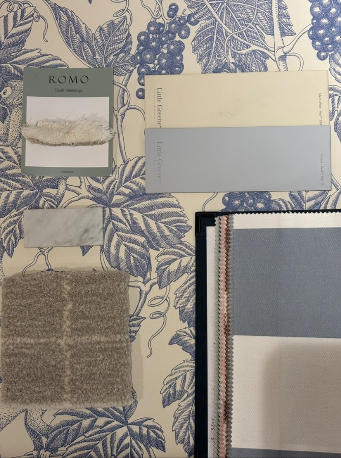 "Här utgick jag från tapeten och tog sedan fram färger och tyg. Jag tyckte om denna tapeten då den gråblå nyansen passade bra med den krämvita färgen samt att detaljerna på tapeten var väldigt fina. Tyget och färgerna valde jag för att de hade samma nyans på färgerna som på tapeten."